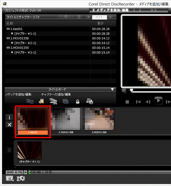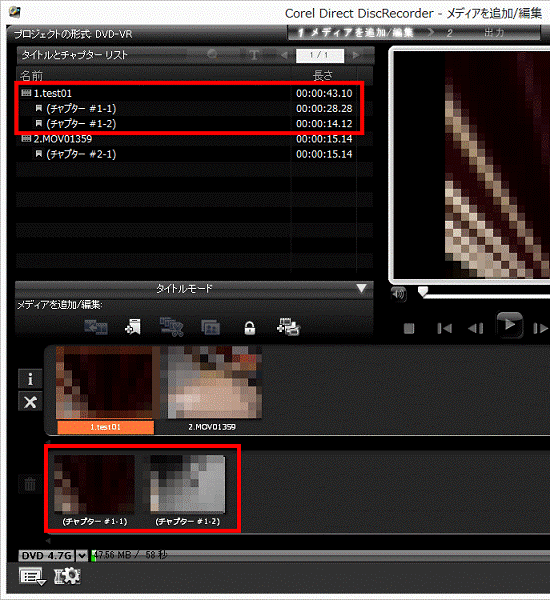 アドバイス結合したビデオは、チャプターとして追加されます。