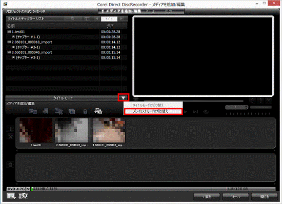 - 「タイトルモード」欄の「▼」ボタンをクリックし、表示される一覧から、「プレイリストモードに切り替え」をクリックします。
