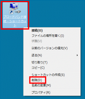 - デスクトップ上の接続アイコンを右クリックし、表示されるメニューから「削除」をクリックします。
