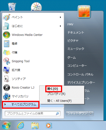 - 「すべてのプログラム」を右クリックし、表示されるメニューから「開く」をクリックします。