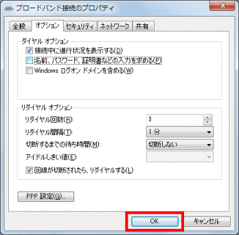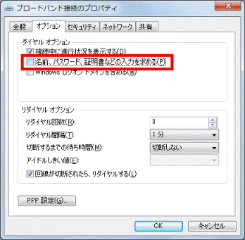 - 「ダイヤルオプション」欄の「名前、パスワード、証明書などの入力を求める」をクリックしてチェックを外します。