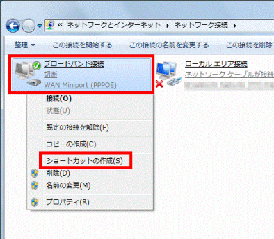 接続アイコンを右クリックし、表示されるメニューから「ショートカットの作成」をクリックします。