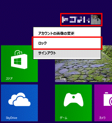 - スタート画面でアカウント名をクリックまたはタップして「ロック」を選択します。