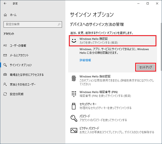 「Windows Hello 顔認証」をクリックし、表示される「セットアップ」ボタンをクリックします。 - 「顔認証」と表示されている場合