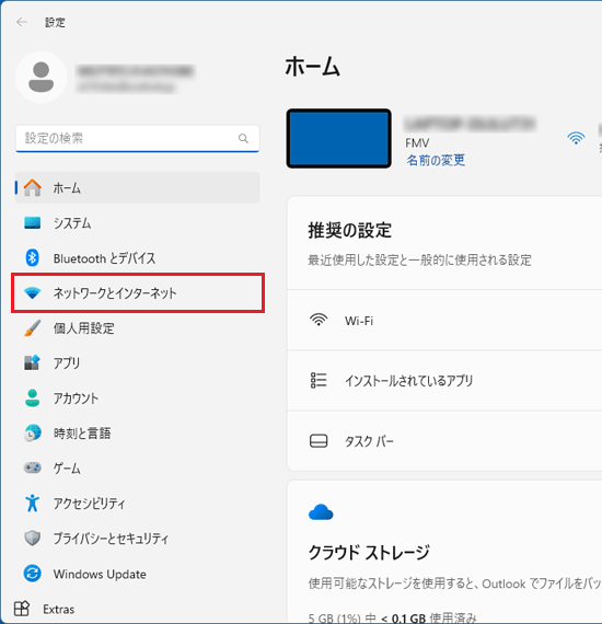 アドバイス「ネットワークとインターネット」が表示されていない場合は、「設定」の左にある「