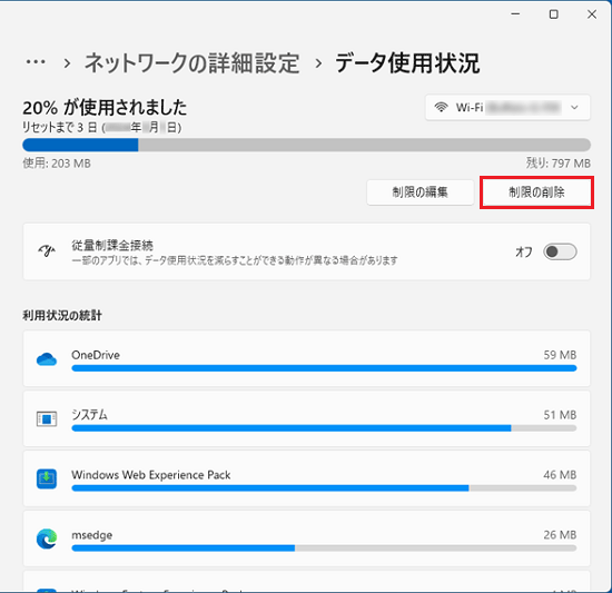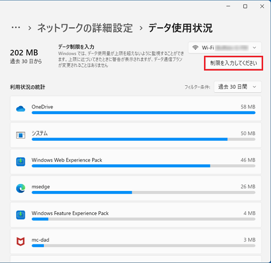 (「このネットワーク上のデータ使用量を制御するためのデータ通信量上限」と表示されている場合)