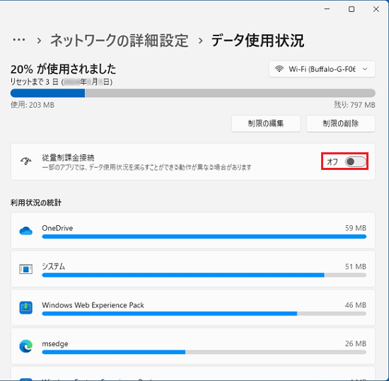 「従量制課金接続」のスイッチをクリックして「オフ」(白色)にします。