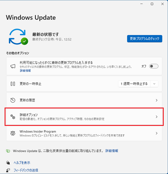 」(ナビゲーションを開く)→「Windows Update」の順にクリックします。 - 「詳細オプション」をクリックします。