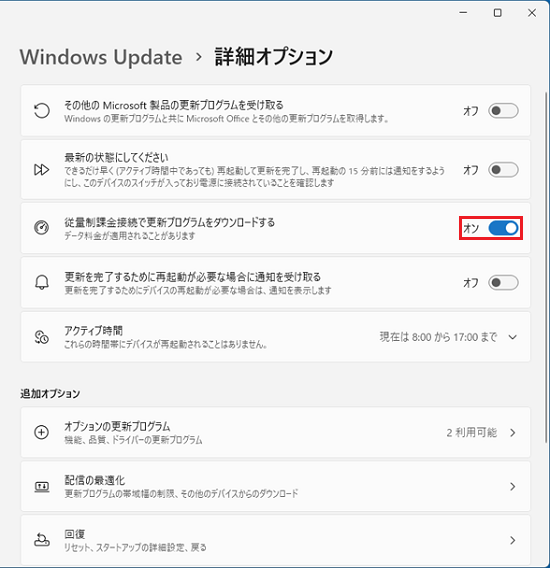 - 「従量制課金接続で更新プログラムをダウンロードする」のスイッチをクリックして「オン」(青色)にします。