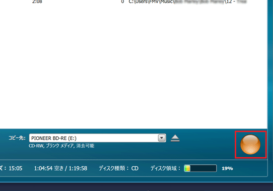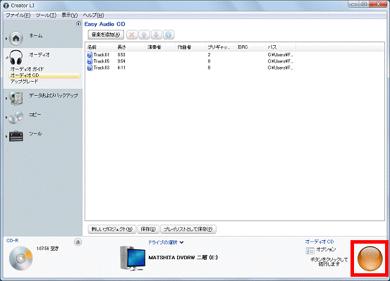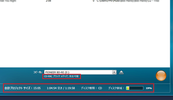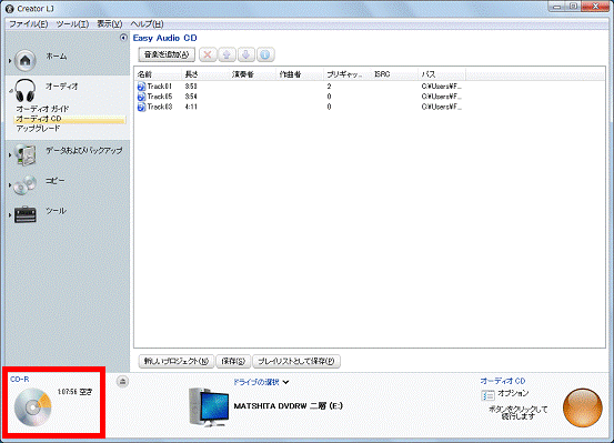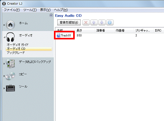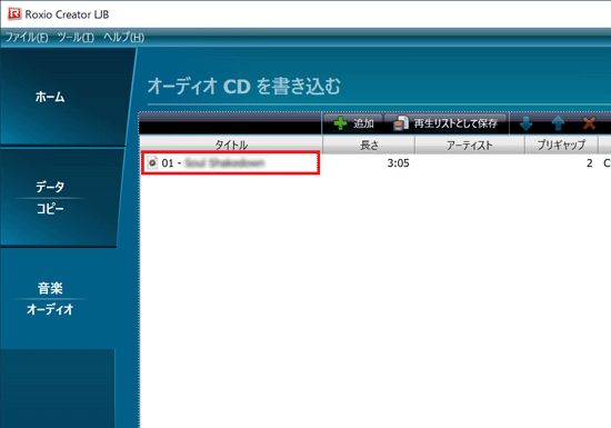 読み込んだ音楽(ディスクに書き込む音楽)が表示されていることを確認します。