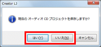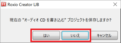 右上の赤い「×」ボタンをクリックし、Roxio Creator LJを終了します。 - 「現在の オーディオ CD プロジェクトを保存しますか?」と表示されます。