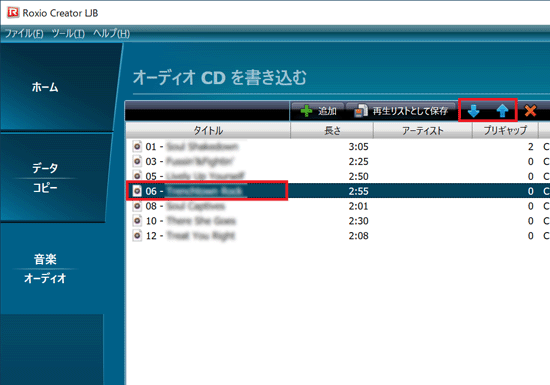 - 追加した音楽の順番を変更する場合は、順番を変更する音楽をクリックし、「↑」(または「↓」)ボタンをクリックします。
