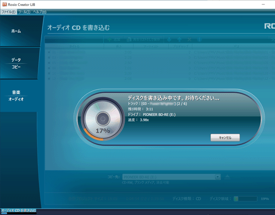 アドバイス書き込む音楽の数や時間(長さ)によって、完了までの時間が異なります。