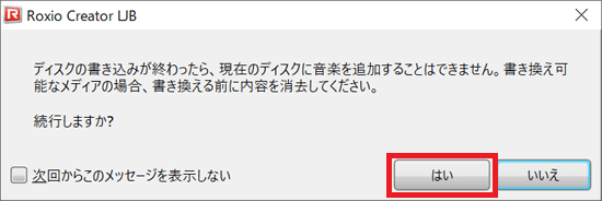アドバイス「ディスクの書き込みが終わったら、現在のディスクに音楽を追加することはできません。」と表示された場合は、「はい」ボタンをクリックします。