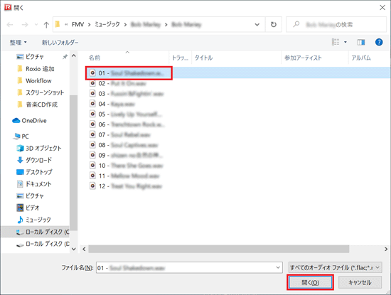 ディスクに書き込む音楽をお好みでクリックし、「開く」ボタンをクリックします。