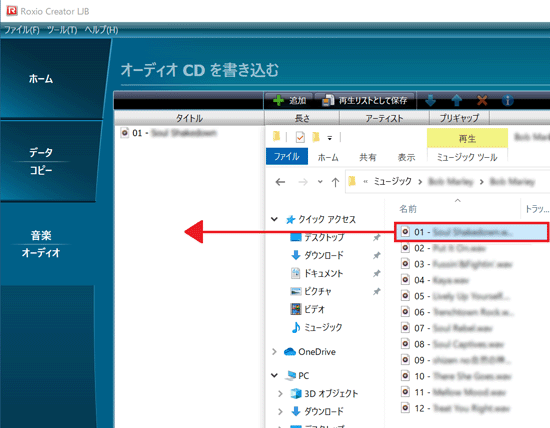 - 音楽ファイルを、Roxio Creator LJBのプロジェクトウィンドウにドラッグし、マウスのボタンから指を離すことでも、音楽ファイルを追加できます。