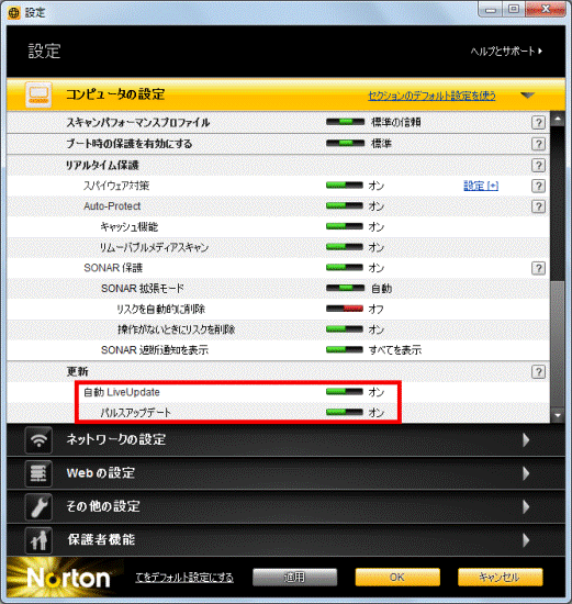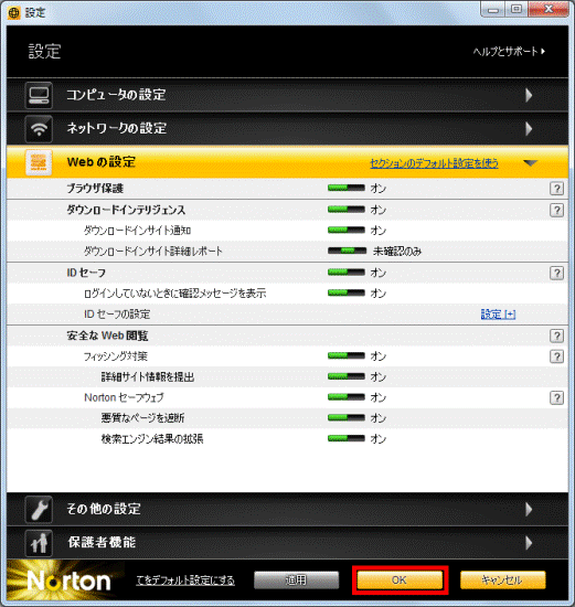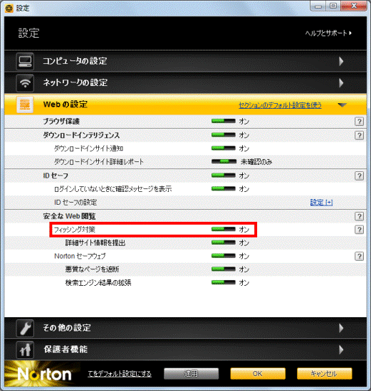 - フィッシング対策やNortonセーフウェブは、初期の設定では両方とも有効に設定されています。