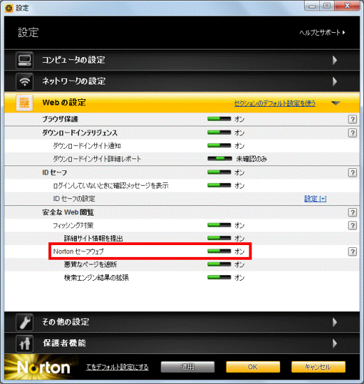 - 「Nortonセーフウェブ」がオン(緑色)になっていることを確認します。