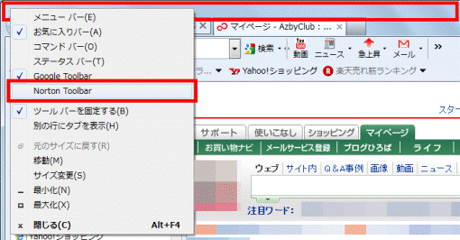 画面上部の何もないところを右クリックし、表示されるメニューから「Norton Toolbar」をクリックしチェックを付けます。