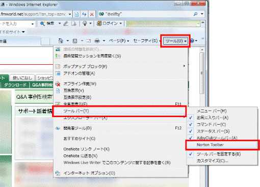 「ツール」→「ツールバー」→「Norton Toolbar」の順にクリックし、「Norton Toolbar」にチェックを付けます。