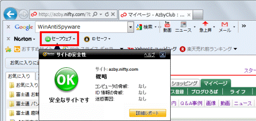 「Norton Toolbar」の「セーブウェブ」ボタンをクリックし、表示される「サイトの安全性」で、表示しているホームページが安全かどうかを確認します。