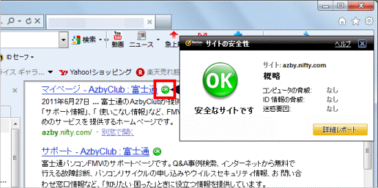 NortonツールバーでNorton評価アイコンをクリックすると、ホームページの安全性情報を表示します。