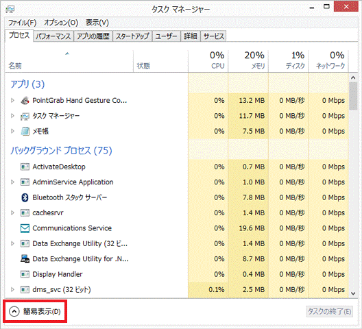 アドバイス詳細表示で「タスクマネージャー」が表示された場合は、「簡易表示」をクリックして、表示を切り替えます。