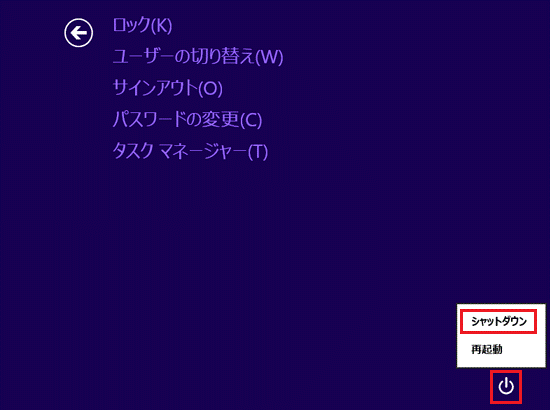 画面右下の電源ボタンのマークをクリックし、表示されるメニューから「シャットダウン」をクリックします。