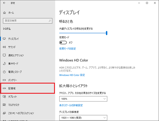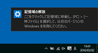 - Cドライブの空き容量が少なくなると、画面の右下に「記憶域の解放」と表示される場合があります。