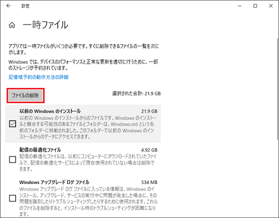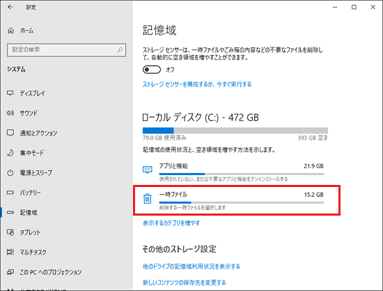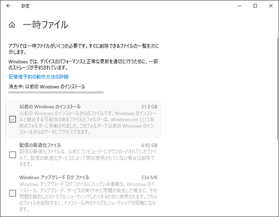 「Windows.old」フォルダーを削除するには、記憶域の設定から「以前のWindows のインストール」を削除します。