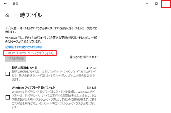 - 「一時ファイルのクリーンアップが完了しました」と表示されたら、削除は完了です。