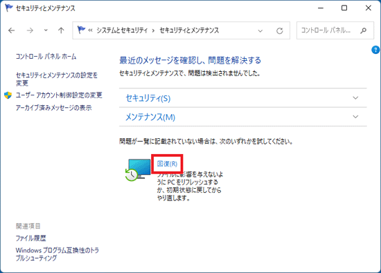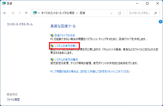 (「推奨される復元」と表示された場合) - 「推奨される復元」や「システムの復元の取り消し」などの選択項目が表示されない場合