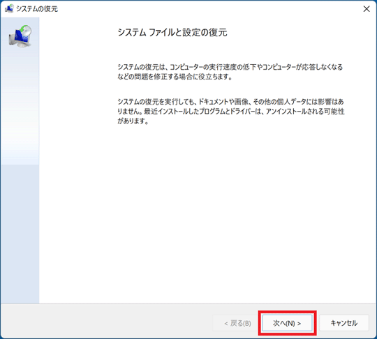「別の復元ポイントを選択する」をクリックして、「次へ」ボタンをクリックします。