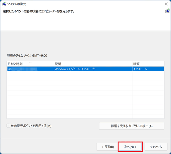 アドバイス- 「他の復元ポイントを表示する」が表示されている場合は、クリックしチェックを付けると、過去の復元ポイントも一覧に表示されます。