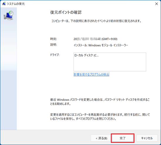 復元ポイントの時刻や説明を確認し、復元して問題がなければ「完了」ボタンをクリックします。