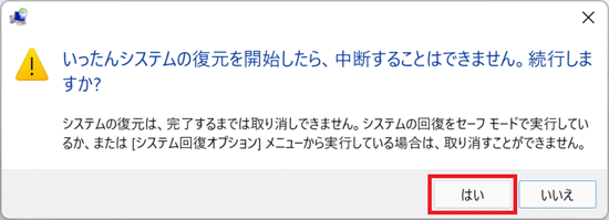 - 「いったんシステムの復元を開始したら、中断することはできません。続行しますか?」と表示されます。