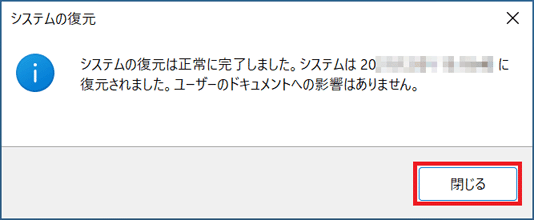 完了するまで、そのまましばらく待ちます。 - システムの復元が完了するとパソコンが再起動し、「システムの復元は正常に完了しました。」と表示されます。