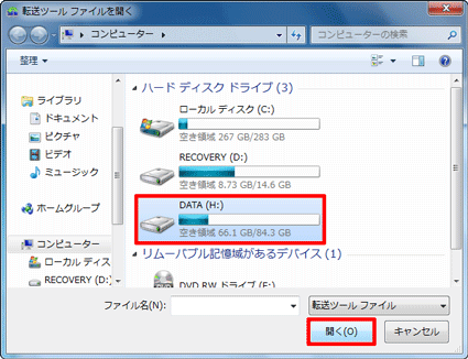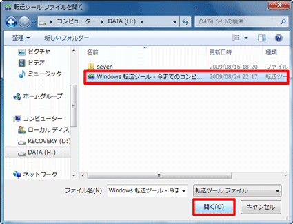 - 古いパソコンで保存したファイルを選択し、「開く」ボタンをクリックします。