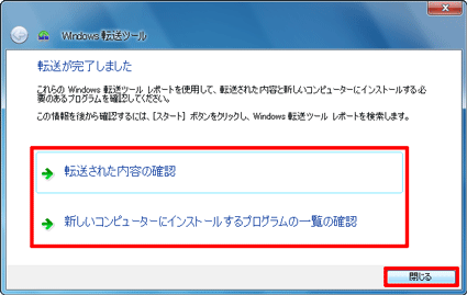 - 転送された内容や、新しいパソコンでインストールする必要があるプログラムを確認する場合は、それぞれの項目をクリックします。