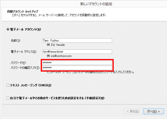- 「パスワード」と「パスワードの確認入力」に、プロバイダーから指定されているメールパスワードを入力します。
