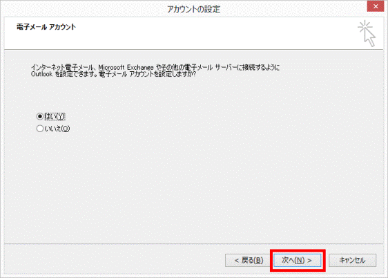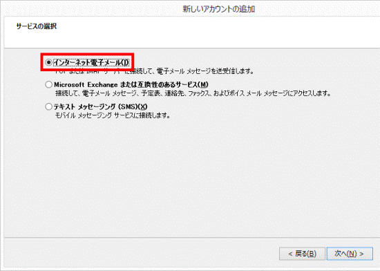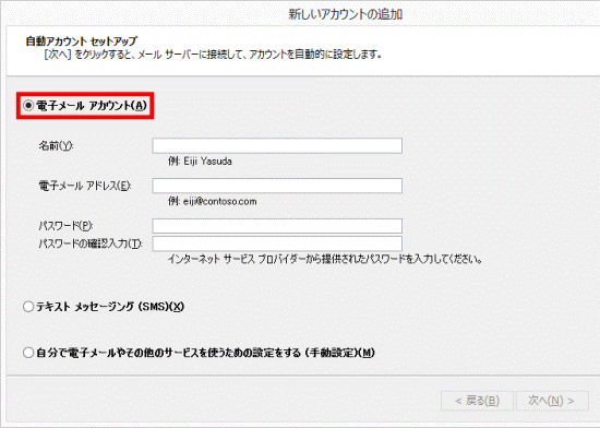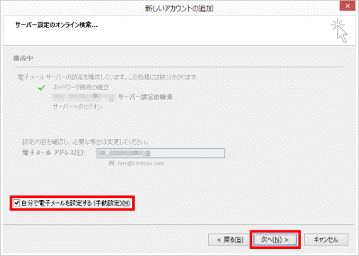 「自分で電子メールを設定する(手動設定)」をクリックしチェックを付けてから、「次へ」ボタンをクリックします。