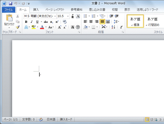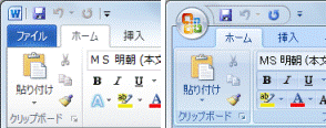 Word 2010は、画面の左上に、青色の「ファイル」タブが表示されます。