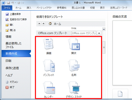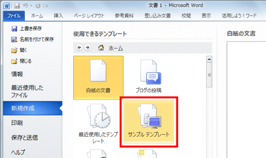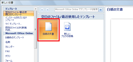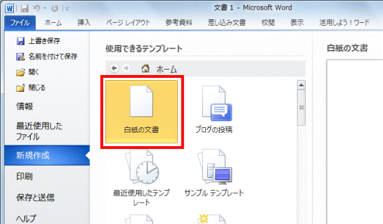 - 「使用できるテンプレート」欄から、「白紙の文書」をダブルクリックします。
