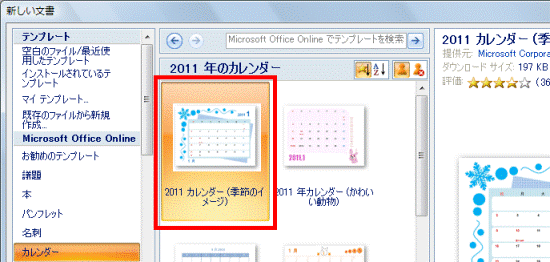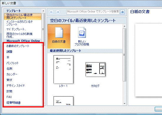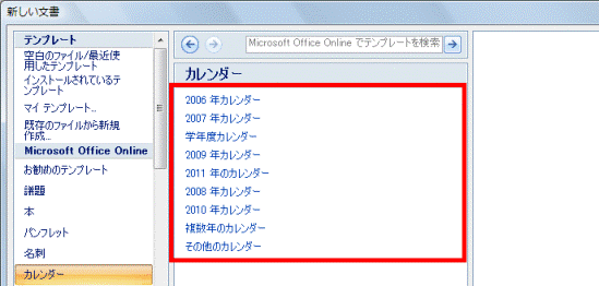 「テンプレート」欄の「Microsoft Office Online」の下に表示される項目から、目的の項目をクリックします。