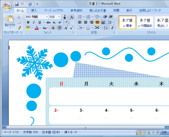 「ホーム」ボタンの左にある「←」ボタンをクリックすると、ひとつ前の画面が表示されます。 - テンプレートの書式が適用された新しい文書が作成されます。