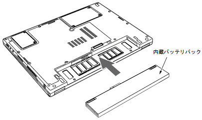 バッテリパックを取り付けるときは、バッテリパックをパソコン本体と水平に差し込み、カチッと音がするまでしっかりと押し込みます。内蔵バッテリパックロックは自動的にロックされます。