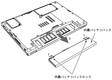 液晶ディスプレイは静かに閉じてください。閉じるときに液晶ディスプレイに強い力が加わると、液晶ディスプレイが故障する原因となることがあります。 - 内蔵バッテリパックロック(2ヶ所)を内側にスライドさせながら、バッテリパックを引き出します。