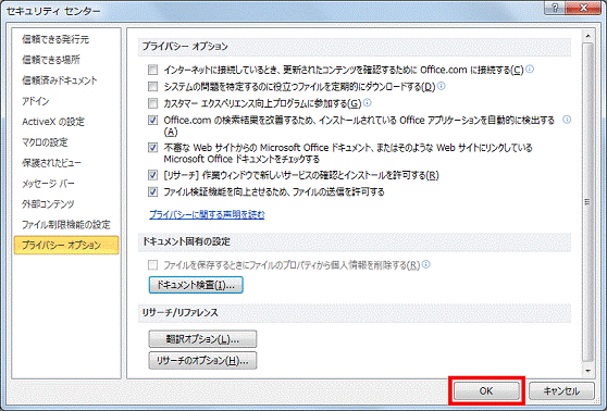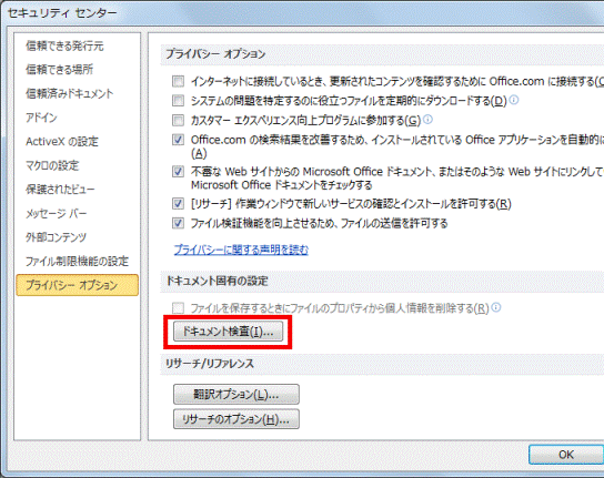 「ドキュメントのプロパティと個人情報」にチェックがあることを確認します。