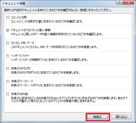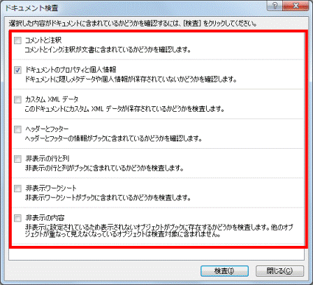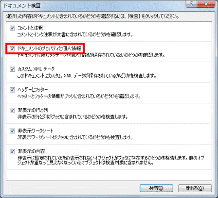 - 一覧にある「ドキュメントのプロパティと個人情報」以外の項目をすべてクリックし、チェックを外します。