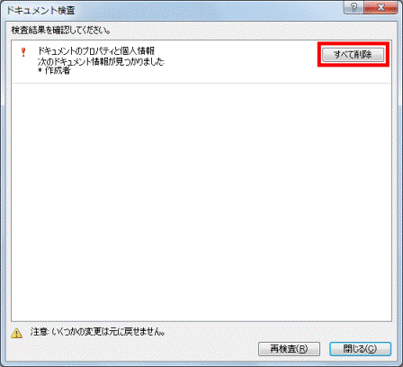 「ドキュメントのプロパティと個人情報」の「すべて削除」ボタンをクリックします。